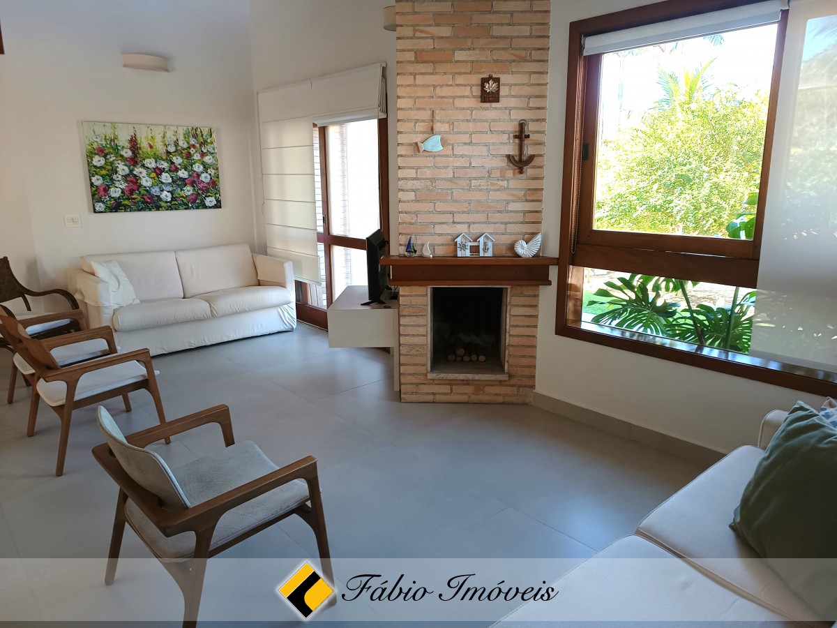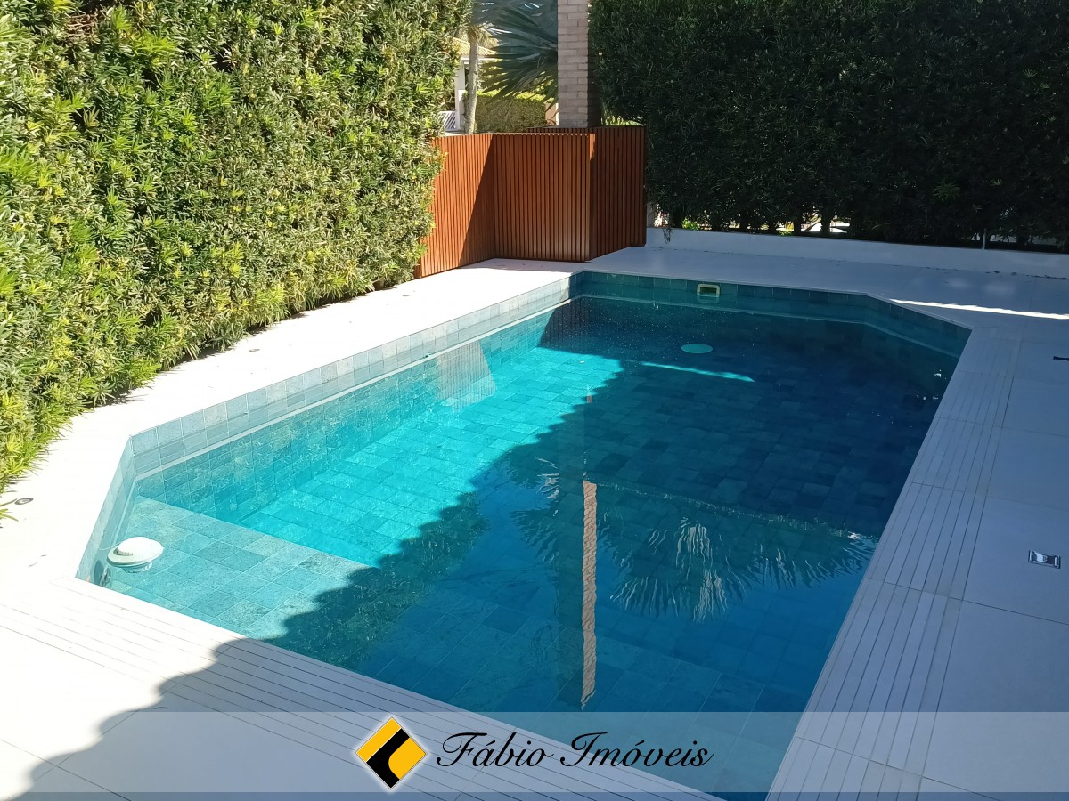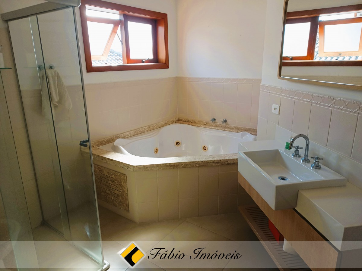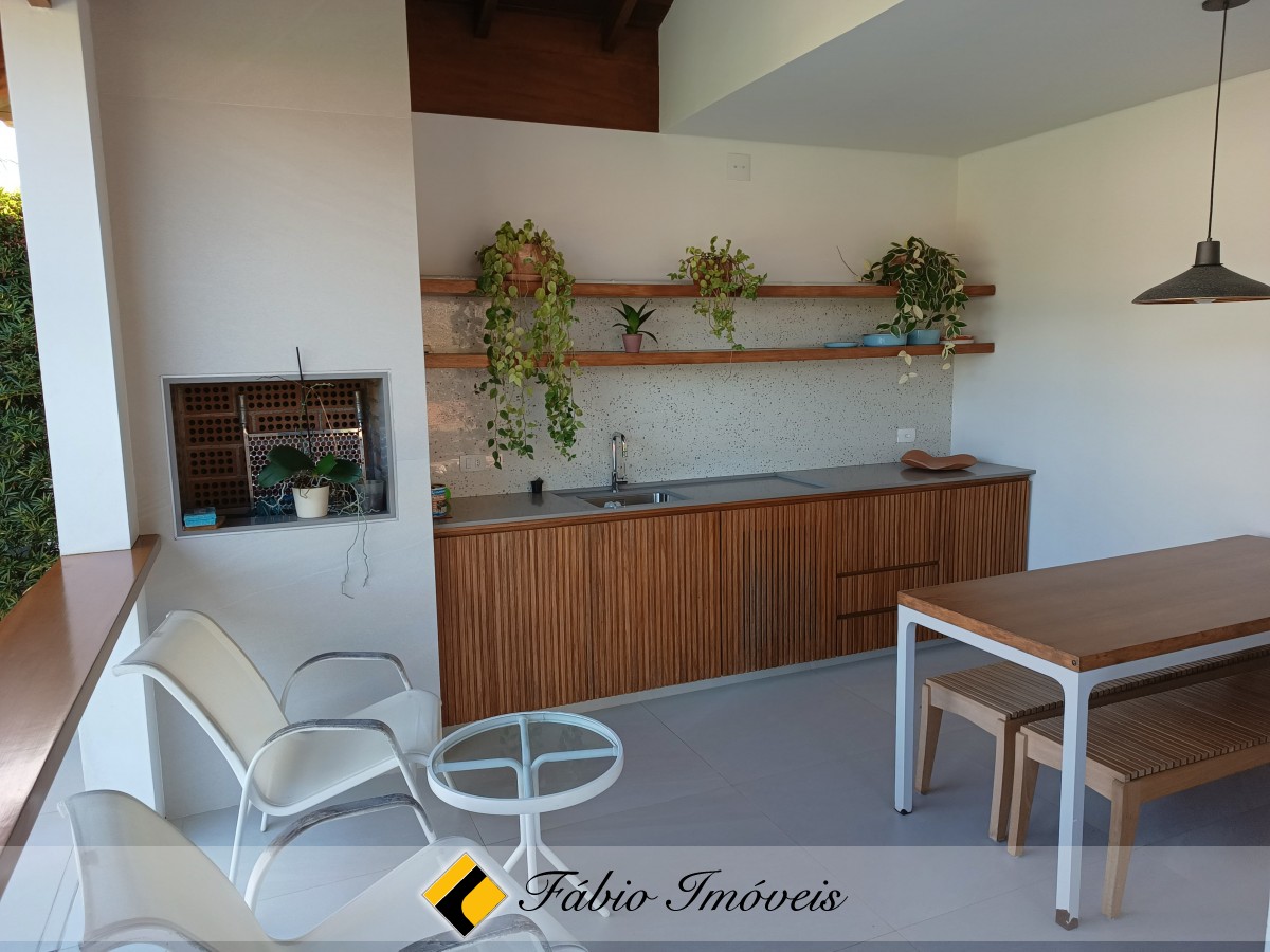 Sala para 3 ambientes com pé direito duplo e lareira, cozinha americana, lavanderia, wc social, mezanino com sacada, suíte superior com hidro, área de lazer com churrasqueira e piscina.