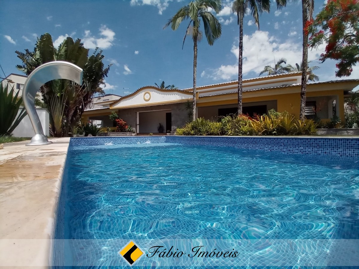 Contém 4 amplas suítes, sala para 2 ambientes, banheiro social, cozinha, varanda, área gourmet com churrasqueira, forno e fogão a lenha, lindo espaço gramado, piscina com cascata, e diversas vagas para veículos.