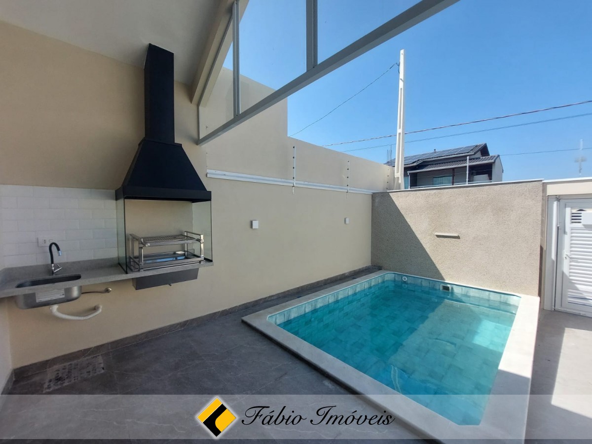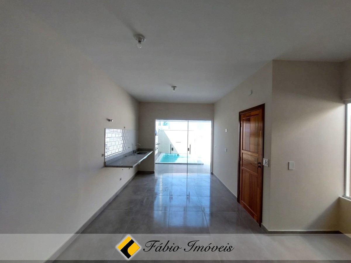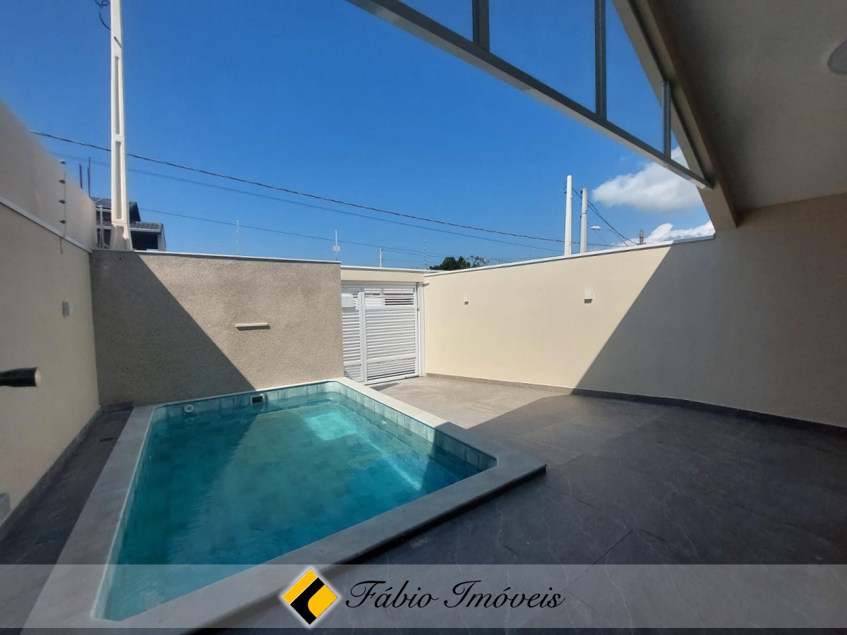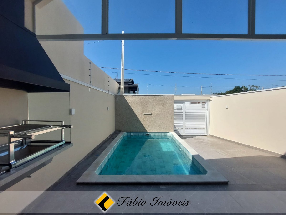 Sala ampla, cozinha conceito aberto, wc social, 2 dormitórios sendo 1 suíte, quintal corredor de ventilação, espaço gourmet com churrasqueira, pia, piscina com cascata, ducha, quintal, garagem para 2 autos, cerca elétrica e alarme com controle remoto.
