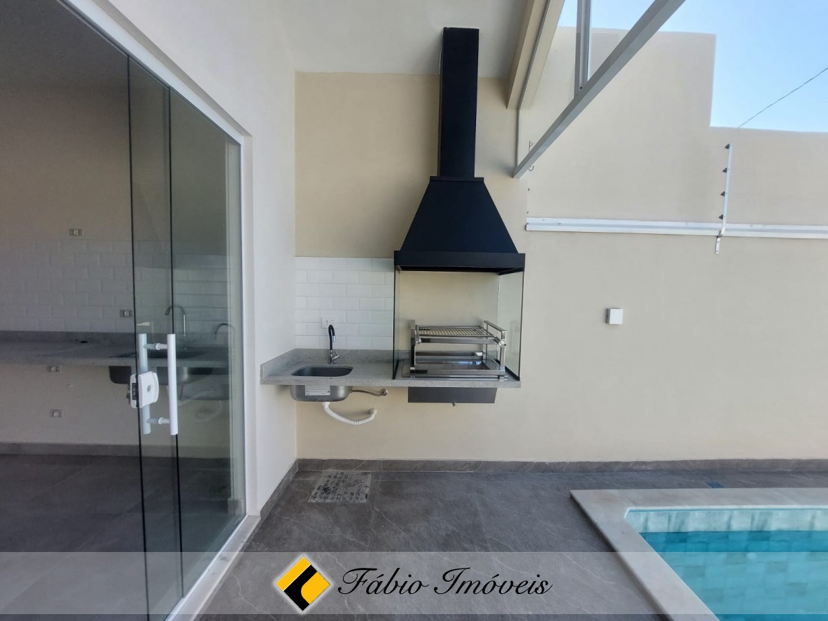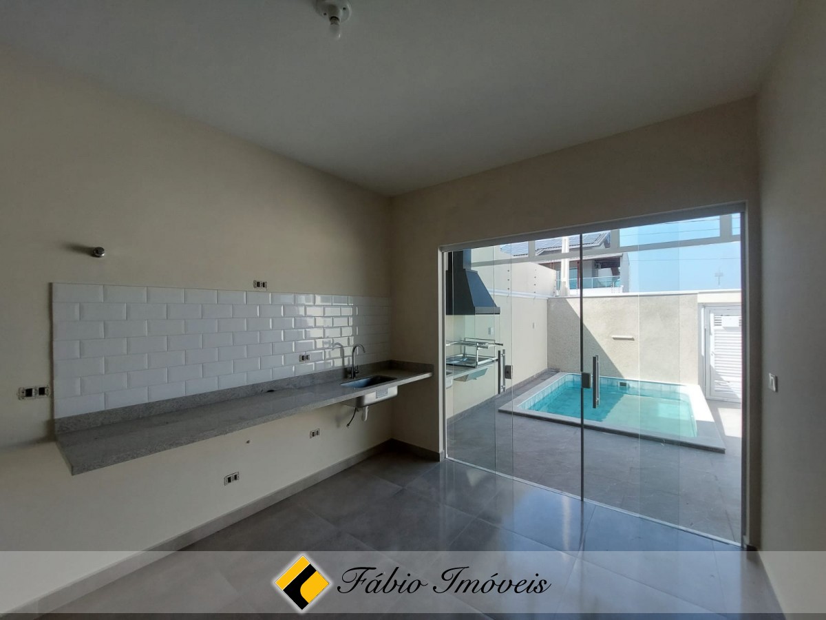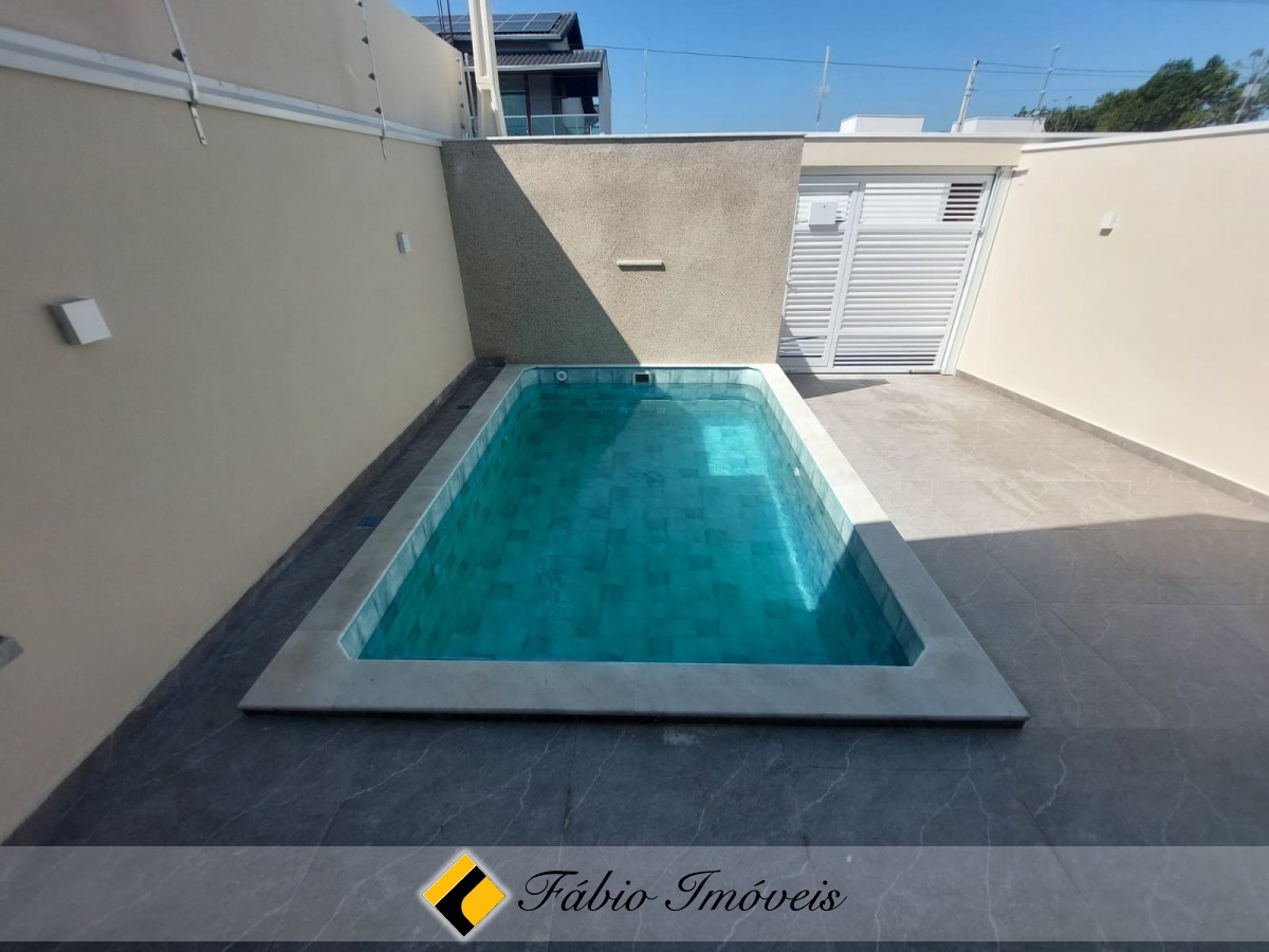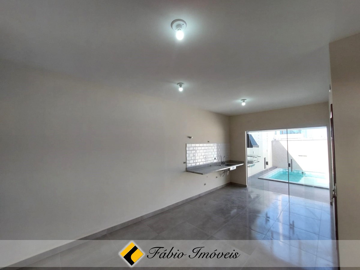 Sala ampla, cozinha conceito aberto, wc social, 2 dormitórios sendo 1 suíte, quintal corredor de ventilação, espaço gourmet com churrasqueira, pia, piscina com cascata, ducha, quintal, garagem para 2 autos, cerca elétrica e alarme com controle remoto.