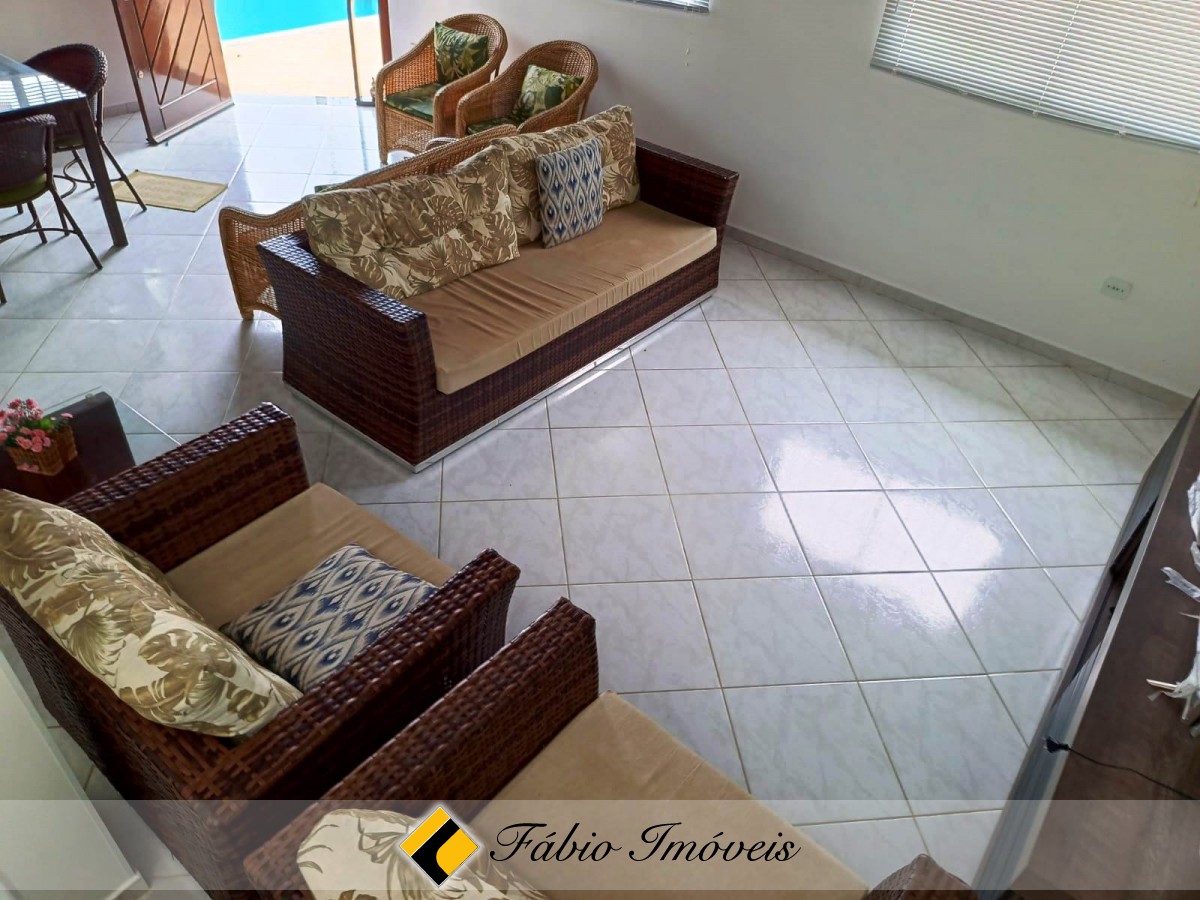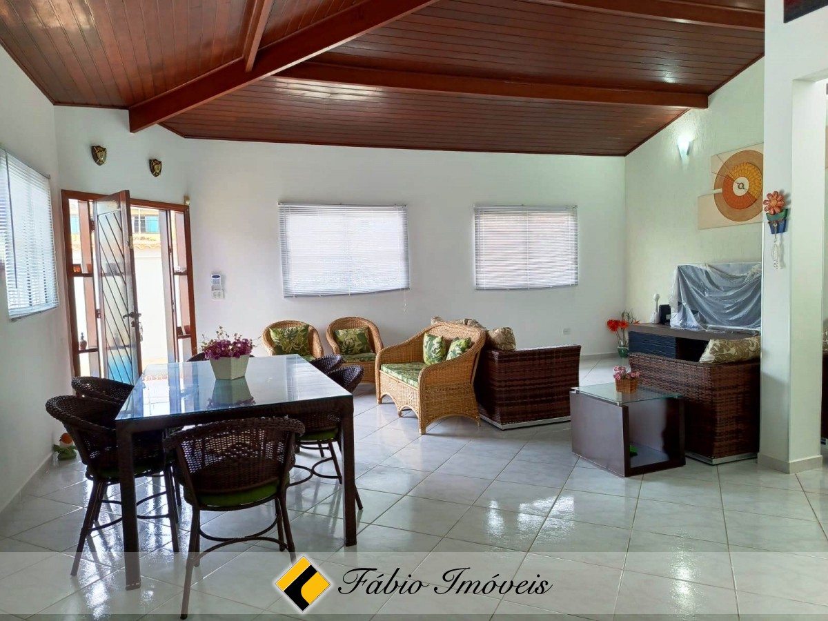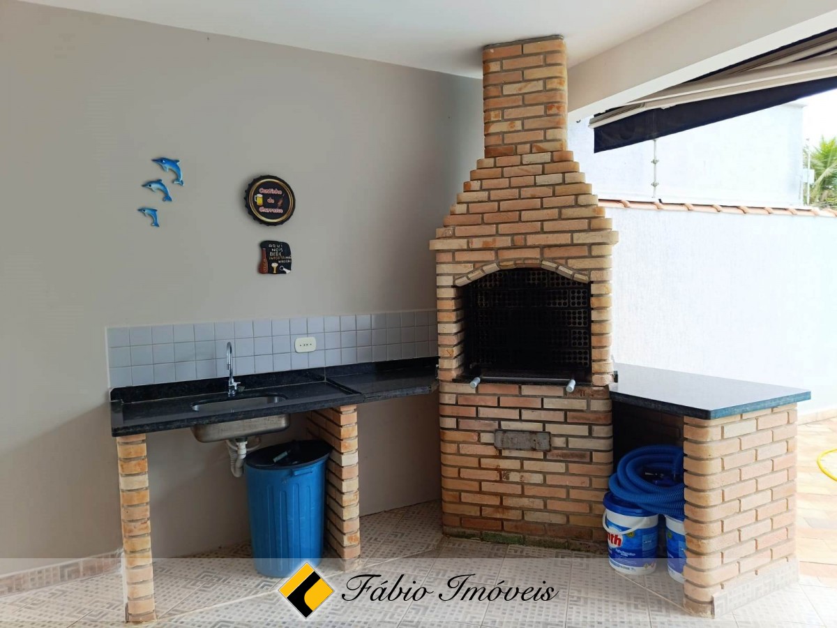 Sobrado a apenas 300m da praia, com 4 suítes, sala para dois ambientes, wc social, cozinha americana com armários, área de serviço, espaço gourmet com churrasqueira e pia, piscina com cascata, jardim e garagem para 02 autos. Imóvel com documentação OK para financiamento bancário.